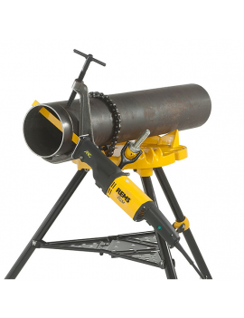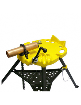 Plateau de travail avec étau à chaine à double mors en acier spécial trempé. Serrage efficaces des tubes jusqu'au ø6" 3 fonctions : support de tube, porte-outils et dispositif de cintrage (ø10-26mm ; 3/8" et 3/4"). Sur trépied pliant avec plateau.