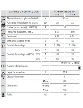 - Intensité de soudage : 3 à 220 A, réglable par bouton rotatif