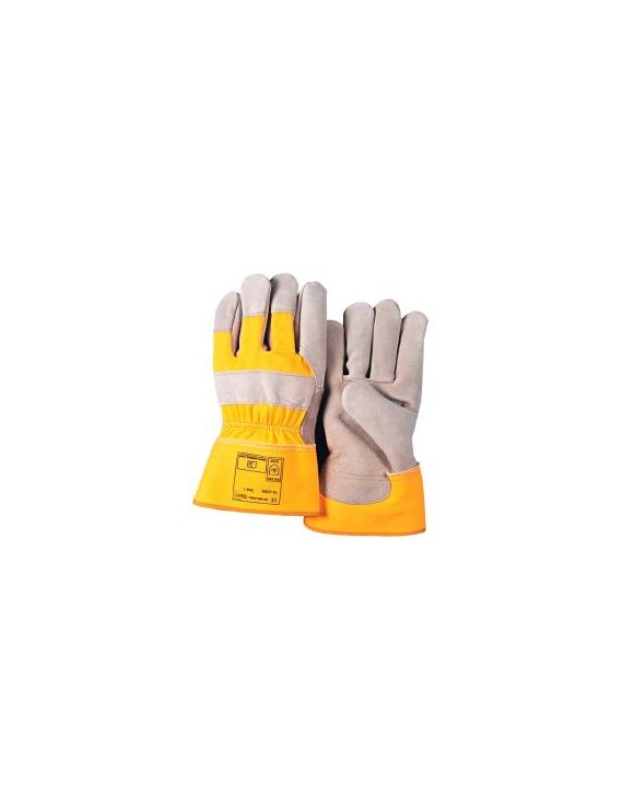 Pouce palmé, paume en croûte de bovin doublée toile avec protège artère; dos toile avec élastique de serrage et renfort cuir sur le dos.