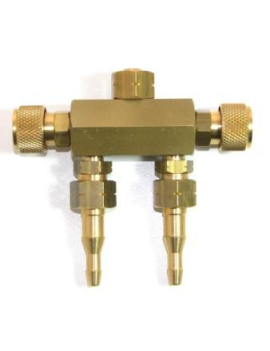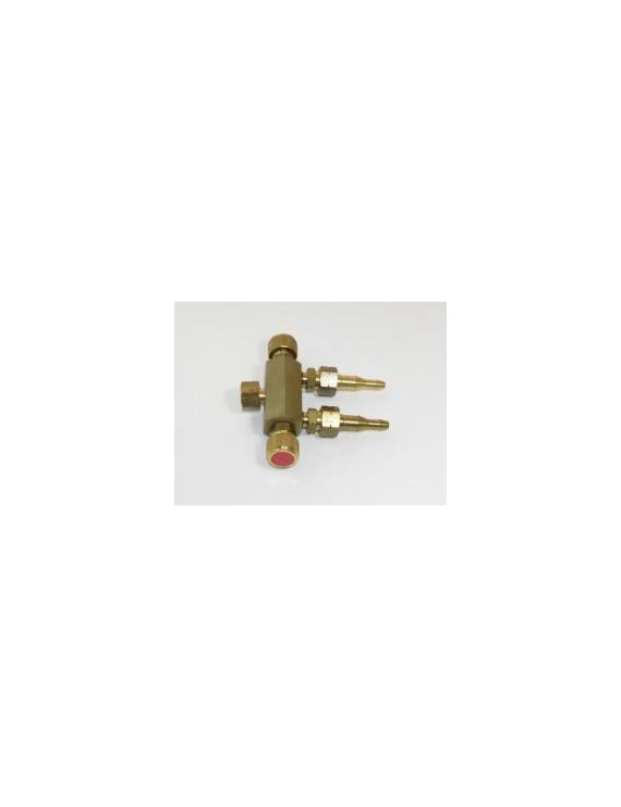 Nourrice double 16x150 gauche acétylène; permet l'alimentation et le réglage séparé de deux postes de travail avec une seule bouteille pour tuyaux diamètre 10x17. Montage en sortie détendeur 16x150D